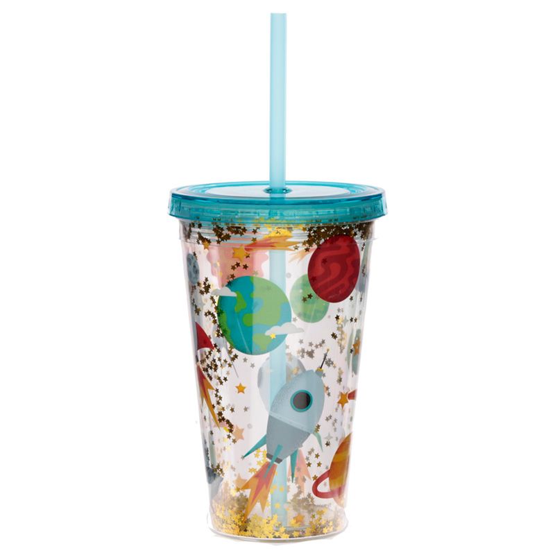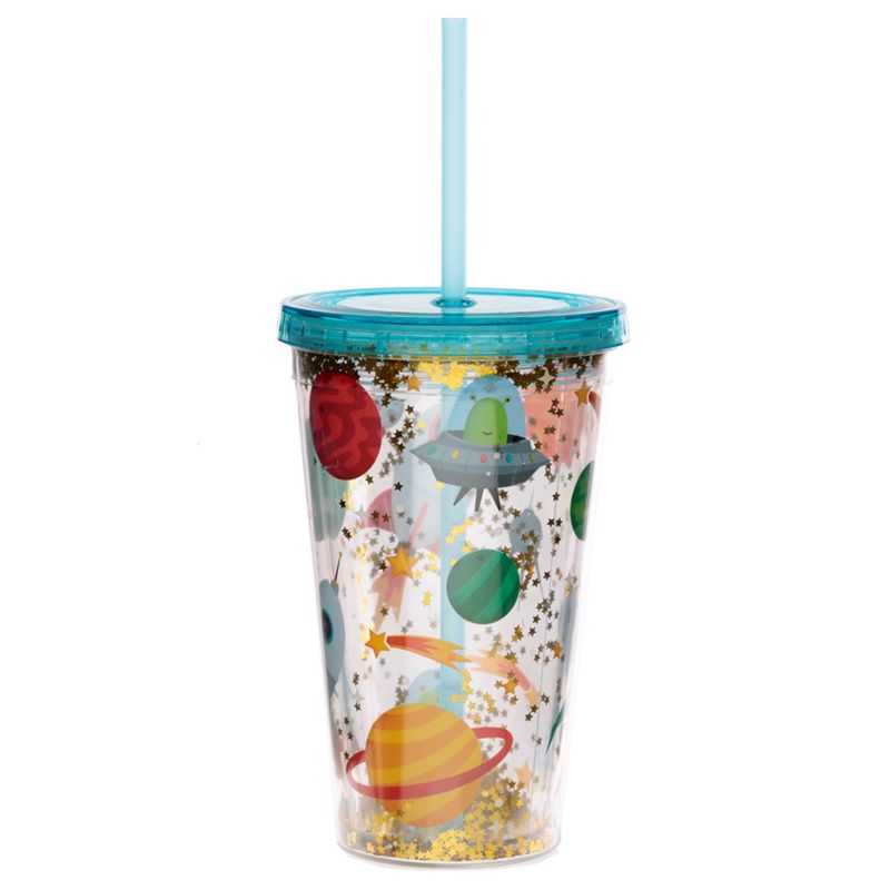 Kubek plastikowy wielorazowy próżniowy z przykrywką i słomką 500ml - "Kosmiczny kadet"