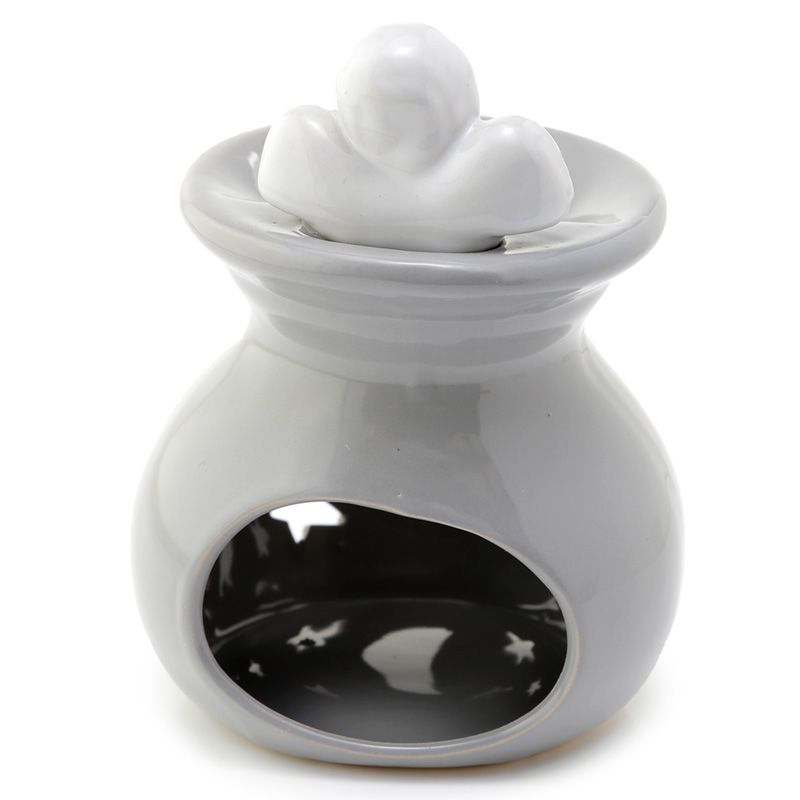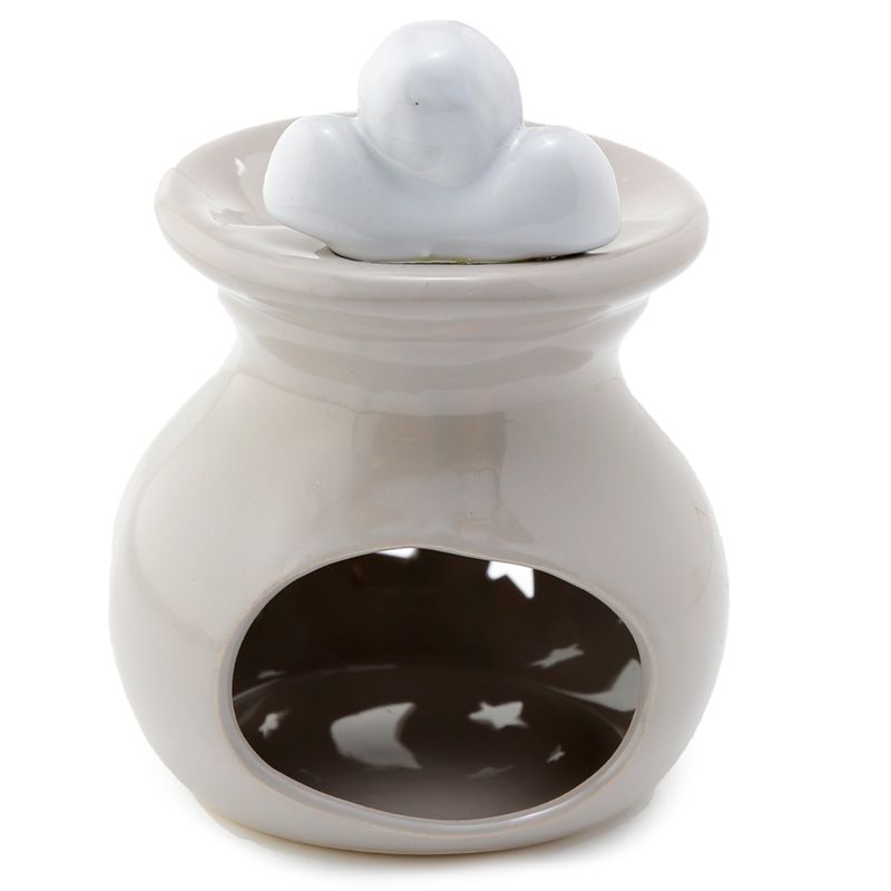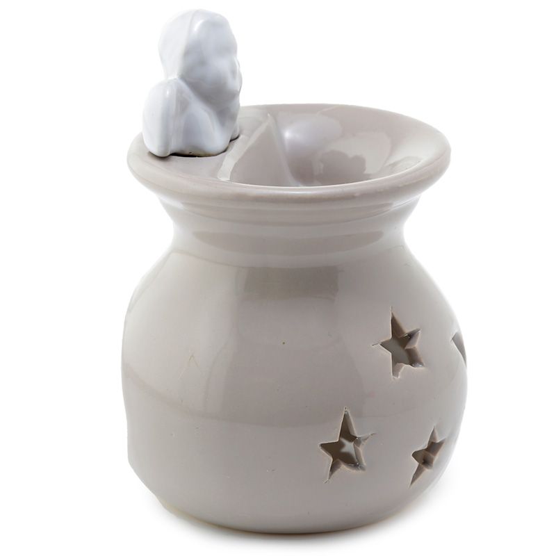 Ceramiczny podgrzewacz olejków i wosku tarta z cherubunkiem i wyciętymi gwiazdkami z księżycem "Eden"