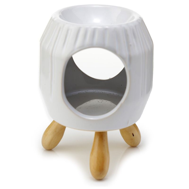 Ceramiczny abstrakcyjny podgrzewacz olejków na drewnianych nóżkach z ozdobnymi naciętymi prążkami "Eden" - biały i szary