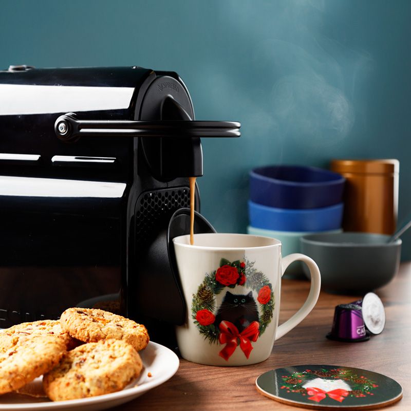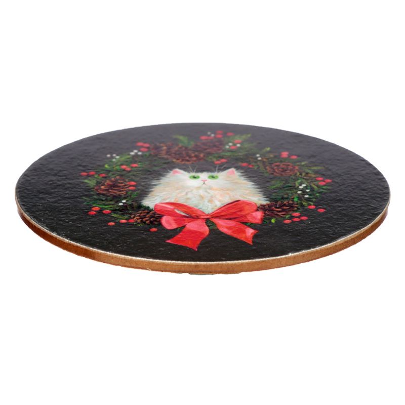Świąteczny kubek porcelanowy z podstawką "Kim Haskins - Kot w wieńcu świątecznym"